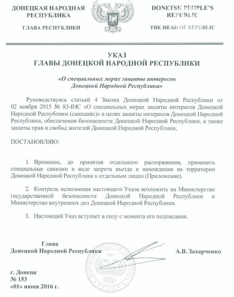 Причины запрета въезда указанным лицам не сообщаются. Отмечается, что "указ" принят в "целях защиты и обеспечения безопасности "ДНР", а также защиты прав и свобод жителей".