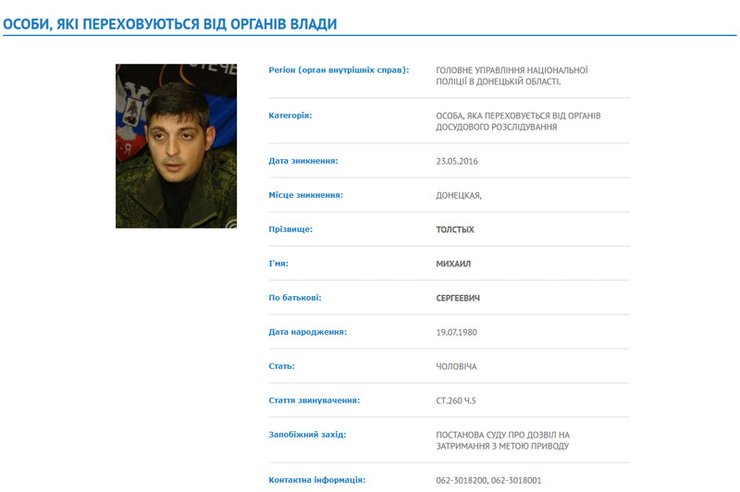Министерство внутренних дел объявило в розыск боевика террористической организации "ДНР", главаря бандформирования "Сомали" Михаила Толстых по прозвищу "Гиви". Об этом говорится на сайте МВД в разделе "лица, которые скрываются от органов власти".