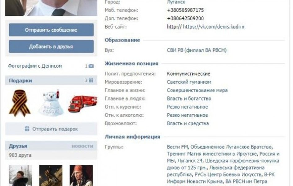 На странице указано, что на данный момент Денис Кудрин проживает в оккупированном Луганске. На странице, в частности, имеются фотографии с геолокацией в Луганске, опубликованные в феврале 2015 года.