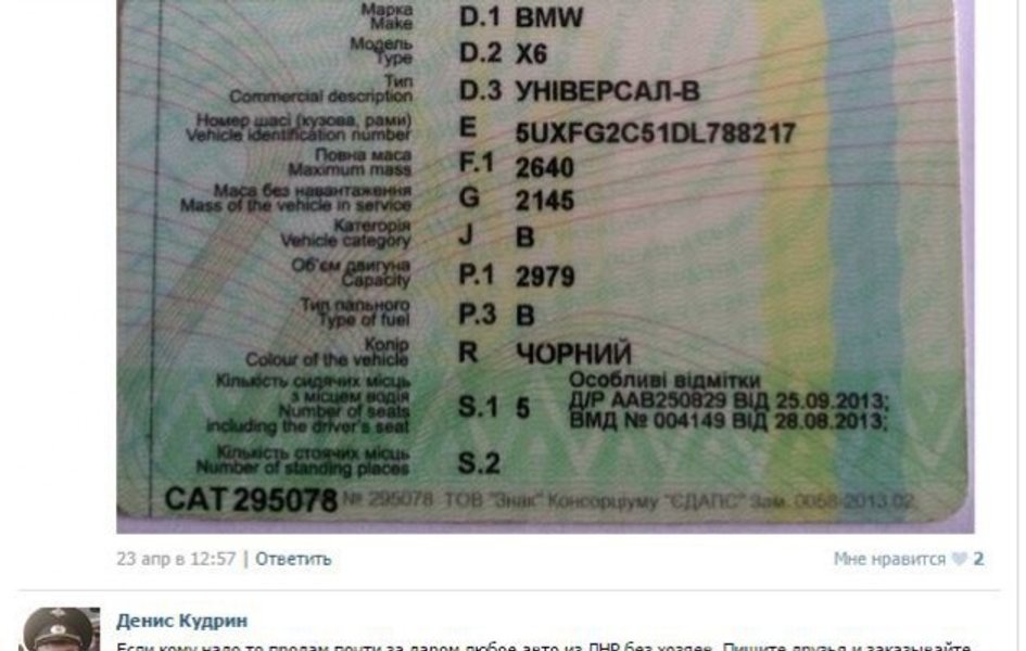Также на его странице много пророссийской пропаганды, фотографий с боевиками. Но самое примечательное из того, что публикует Кудрин, это объявления о продаже отобранных у украинских граждан в Донбассе автомобилей. Среди объявлений есть фотографии техпаспортов автомобилей, выданных в Украине. Некоторые фотографии имеют геолокацию в Белгородской области России, в г. Короча, отмеченном как родной город Кудрина, и г. Белгород. В объявлении Кудрин не скрывает происхождение машин, выставленных на продажу: "Да, забыл - поступил в продажу грузовик 5 т, отличное состояние, отобрали летом в 2014 года у непослушного гр.Украины, пробег смешной. Цена 1500$", или " Если кому надо, то продам почти за даром любое авто из ЛНР без хозяев. Пишите друзья и заказывайте, есть от БМВ Х6 до грузовых..."