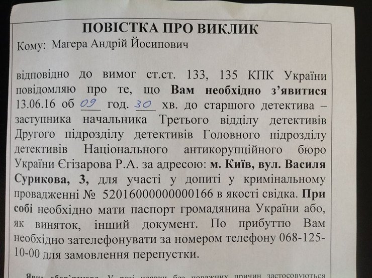 "Указан номер уголовного производства. Вызывают в качестве свидетеля. Судя по всему, это уголовное производство по делу "амбарных книг" ПР. Я не совсем понимаю свою ценность в качестве свидетеля в этом уголовном производстве, но, поскольку есть требование закона появиться в НАБУ, то в понедельник в 9:30 буду там", - заявил Магера.