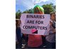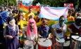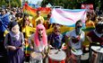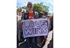 Часть участников акции держат флаги ЛГБТ-сообщества. Некоторые завернулись в них. Также они держат плакаты с лозунгами, смысл которых - любовь является правом человека, а также "Права ЛГБТ = права человека". Во главе колонны играют барабанщицы в масках.