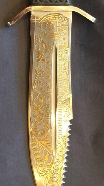 Согласно его сообщению в Facebook и прикрепленной к сообщению фотографии, на клинке выгравировано: "Служба безопасности президента Российской Федерации".