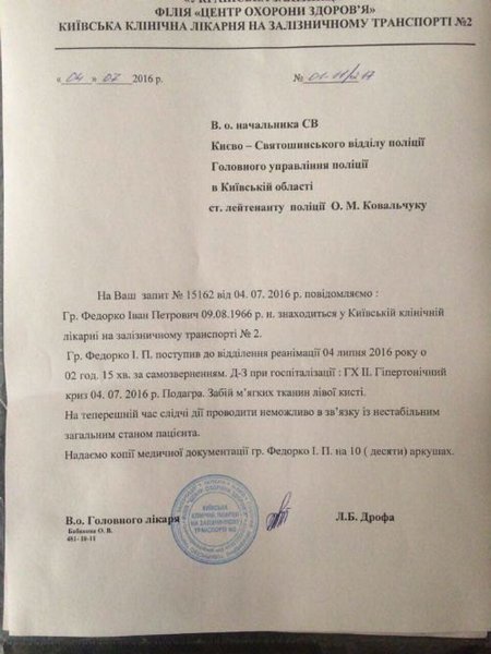 "Силовики до сих пор не смогли взять кровь на анализ у Федорко для определения уровня алкоголя в ней. Этому, в том числе, препятствуют медики. В частности, Киево-Святошинское отделение полиции получило от них ответ о невозможности проведения следственный действий, поскольку у Федорко - "подагра, гипертонический криз и ушиб мягких тканей левой кисти", - говорится в сообщении.
