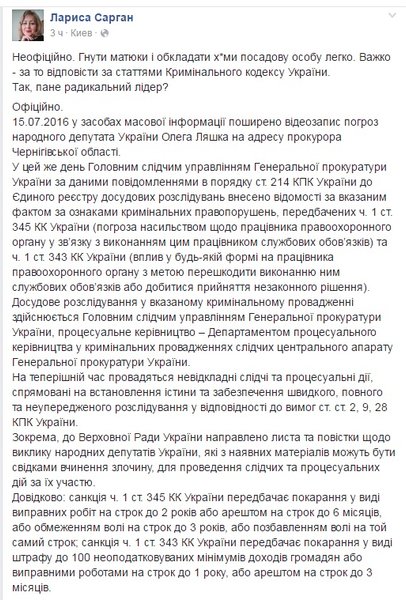 Генеральная прокуратура возбудила уголовное дело по факту угроз лидера Радикальной партии, народного депутата Олега Ляшко в адрес губернатора Черниговской области Виктора Носенко. Об этом на своей странице в Facebook написала пресс-секретарь генпрокурора Юрия Луценко Лариса Сарган.
