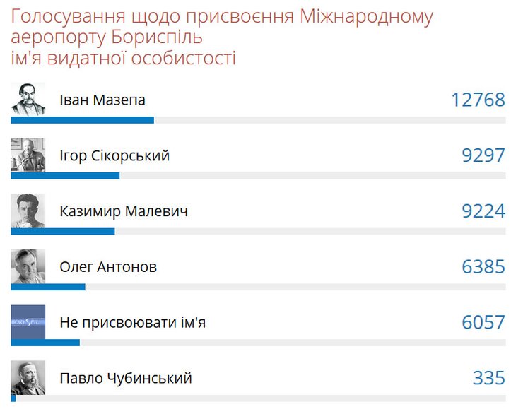 За присвоение имени Мазепы аэропорту проголосовали 12,8 тыс. человек. За авиаконструктора Игоря Сикорского отдали 9297 голосов, третьим лидирующим вариантом стал художник Казимир Малевич с результатом 9224 голоса.