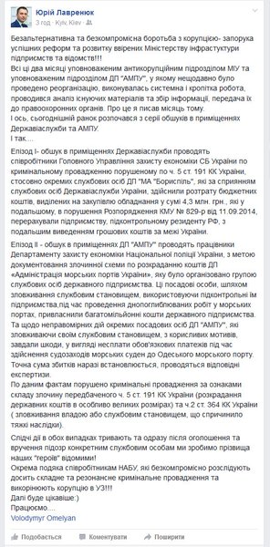 Во вторник прошла серия обысков в помещениях Государственной авиационной службы и Администрации морских портов Украины. Об этом сообщил на своей странице в Facebook заместитель министра инфраструктуры Юрий Лавренюк.