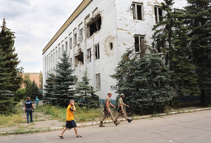 Кирпичное трехэтажное здание в центре города раскурочено со всех сторон: разбиты стены, из окон торчат длинные острые куски стекла, на входе черным написано "Мины", над едва держащимся подъездом возвышается украинский флаг. Сквозь решетку на полуразбитом окне виднеется комната, внутри которой бардак. На полу разбросаны бумаги. Если бы не календарь 2014 года на стене — время, когда жизнь в Марьинке остановилась, картина легко сошла бы за брошенную Припять. Из-за угла то одного, то другого дома показываются люди в форме с автоматами. Украинские военные неофициально говорят, что диверсионно-разведывательных групп противника здесь много и ведут они себя как дома.