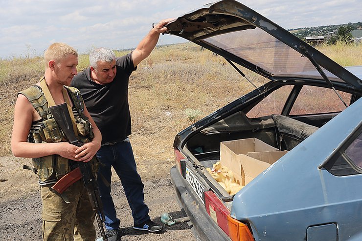 Каждый желающий попасть в Гранитное проходит досмотр. Сегодня его проводит Миша — белобрысый парень 25 лет с добрыми ярко-голубыми глазами и красной от загара кожей. Война уже оставила на нем свои отпечатки — морщины сорокалетнего мужчины, дрожащие губы и большой шрам на тыльной стороне ладони — задел осколок, а в госпитале написали, что упал с машины. Миша слегка сутулится под тяжестью свисающего автомата. На нем жилетка цвета хаки, под ней — старая полосатая майка, на ногах — остроносые туфли на небольшом каблуке. Берцы и форму ему выдали год назад, и все это давно сносилось. Теперешнюю одежду прислала мама. Купила за его же деньги — часть от скромной зарплаты в 6,8 тыс. грн. В зону АТО Мишу призвали уже второй раз. Не успел повар-кондитер по образованию и металлоконструктор по роду деятельности вернуться в родную Белую Церковь, как через два месяца военком снова пришел с повесткой. Парень мог отказаться, но не стал. Второй год его службы истек 17 июля, но сможет ли он в ближайшее время вернуться домой, пока неясно.