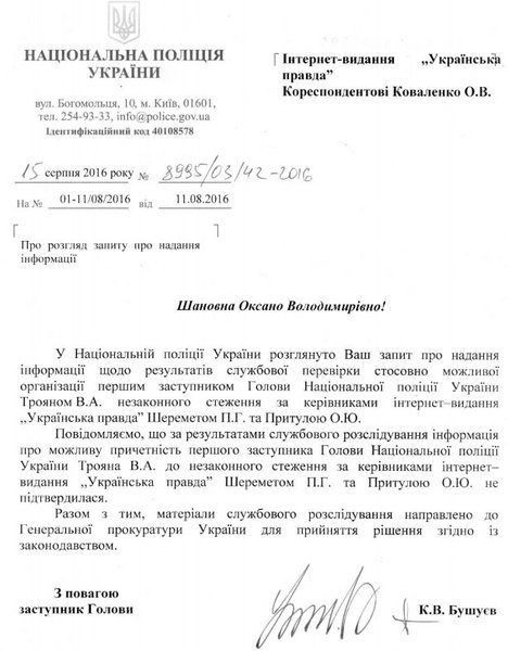 "Сообщаем, что по результатам служебного расследования информация о возможной причастности первого заместителя главы Нацполиции Вадима Трояна к незаконной слежке за руководителями интернет-издания " Украинская правда" Павлом Шереметом и Аленой Притулой не подтвердилась", - сказано в ответе на запрос.