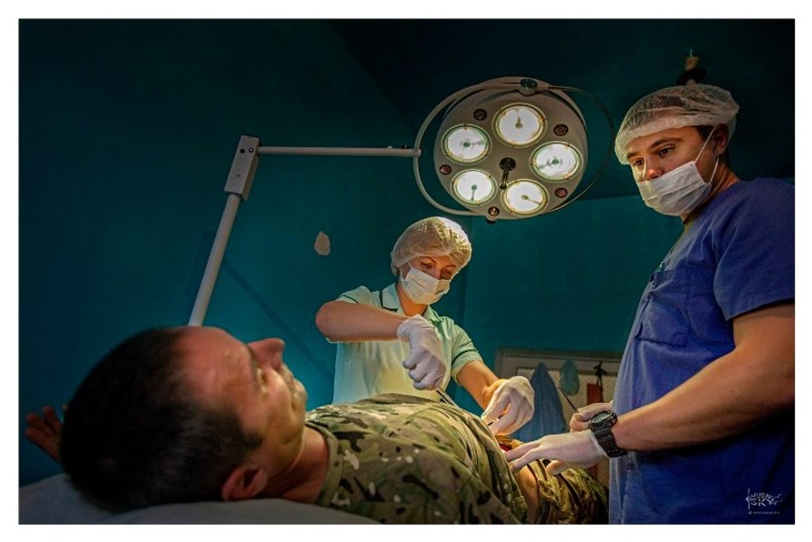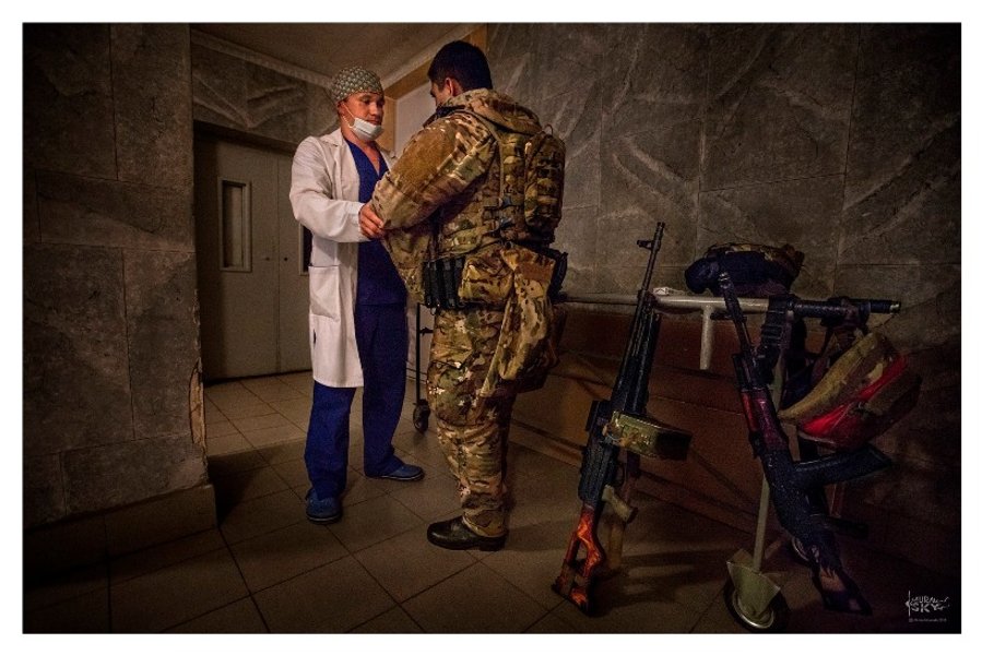 На снимках запечатлены мгновения боев, а также быт военных и работа врачей в зоне АТО.