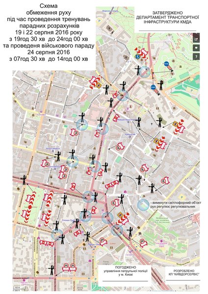 Также 24 августа временно ограничат движение транспорта на ул. Владимирской (на участке от ул. Рейтерской до ул. Большой Житомирской), в пер. Георгиевском, пер. Рыльском, ул. Софиевской (на участке от Михайловского переулка до ул. Владимирской), Владимирском проезде, ул. Аллы Тарасовой, Софиевской площади, Михайловской площади, ул. Трехсвятительской, Европейской площади, ул. Малой Житомирской (на участке от Михайловского переулка до Владимирского проезда), ул. Владимирской (на участке от ул. Льва Толстого до ул. Богдана Хмельницкого), б-р Тараса Шевченко (на участке от ул. Леонтовича до ул. Терещенковской), ул. Терещенковской (на участке от ул. Льва Толстого до б-ра Тараса Шевченко), ул. Институтской (на участке от ул. Крещатик до ул. Шелковичной), ул. Городецкой (на участке от ул. Крещатик до ул. Ольгинской), б-р Тараса Шевченко (на участке от ул. Крещатик до ул. Пушкинской), ул. Богдана Хмельницкого (на участке от ул. Крещатик до ул. Пушкинской), ул. Прорезной (на участке от ул. Крещатик до ул. Пушкинской), ул. Михайловской (на участке от ул. Крещатик до ул. Костельной), ул. Институтской (на участке от ул. Банковой до ул. Ольгинской), ул. Ольгинской, ул. Станиславского, ул. Банковой, ул. Лютеранской (на участке от ул. Шелковичной до ул. Заньковецкой), ул. Заньковецкой, ул. Круглоуниверситетской, пл. Ивана Франко, Бессарабской площади, ул. Десятинной (на участке от Михайловской площади до ул. Владимирской), ул. Большой Житомирской (на участке от Михайловской площади до ул. Владимирской), ул. Набережно-Крещатицкой (на участке от ул. Игоревской до ул. Боричев Ток), ул. Боричев Ток (на участке от ул. Набережно-Крещатицкой до ул. Петра Сагайдачного).