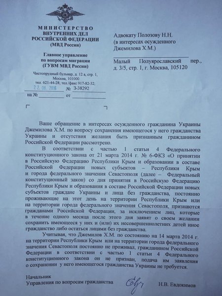 В документе от МВД на имя авдоката говорится: "Учитывая, что Джемилов Х.М. по состоянию на 14 марта 2014 года на территории Республики Крым или на территории Севастополя постоянно не проживал, гражданином РФ, в соответствии с ч.1 ст.4 Федерального конституционного закона он не признан, подачи им заявления о сохранении им имеющегося гражданства не требуется".