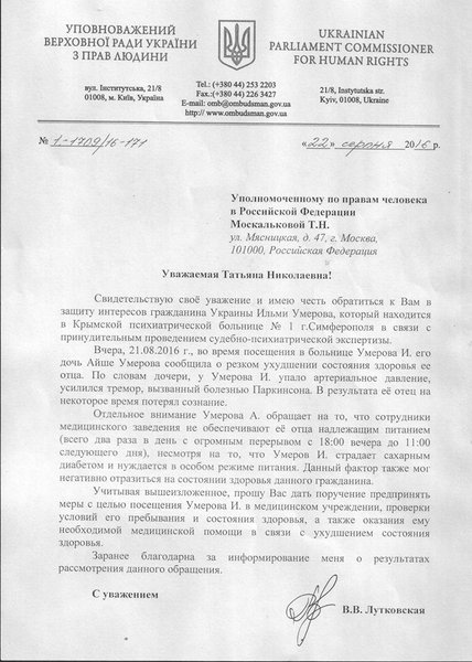 Уполномоченный Верховной Рады Украины по правам человека Валерия Лутковская обратилась к российской коллеге Татьяне Москальковой с просьбой проверить условия содержания и состояние здоровья заместителя председателя Меджлиса крымскотатарского народа Ильми Умерова в психиатрической больнице в оккупированном Россией Симферополе.