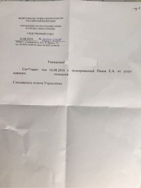 Отмечается, что предъявленная адвокату справка подана от имени следователя, в ней нет ни подписи самого Панова, ни его рукописного текста, где он пишет о своем отказе. Это противоречит нормам российского законодательства, которое на данный момент применяется в Крыму. Согласно ч.1 ст 52 УПК РФ, отказ от услуг адвоката допускается только по инициативе подозреваемого и заявляется в письменном виде.