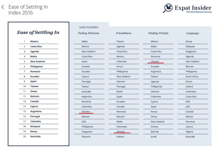 Украина заняла 15 место по критерию "гостеприимство", 19 место по критерию "доброжелательность" и 5 место как страна для "поиска друзей" по индексу "легкости обустройства" иностранцев в стране.