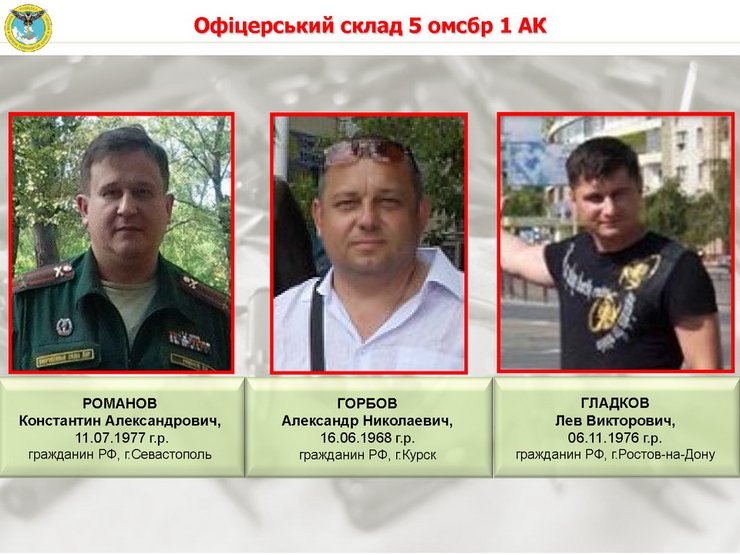 Главное управление разведки Миноброны идентифицировано офицерский состав 5-й отдельной мотострелковой бригады (воинская часть 08805, г. Макеевка) 1-го АК (Донецк) Центра территориальных войск (Новочеркасск) Южного военного округа (Ростов-на-Дону) вооруженных сил Российской Федерации.