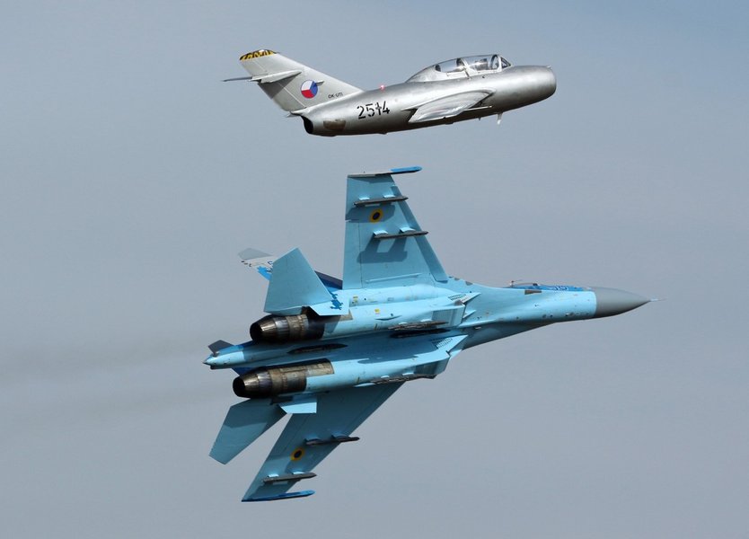Также наш истребитель Су-27 выступил в паре с чешским Миг-15. Их совместный полет вызвал шквал аплодисментов зрителей шоу.