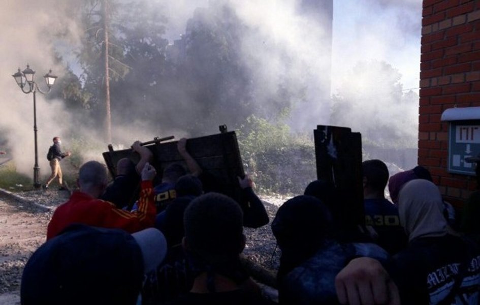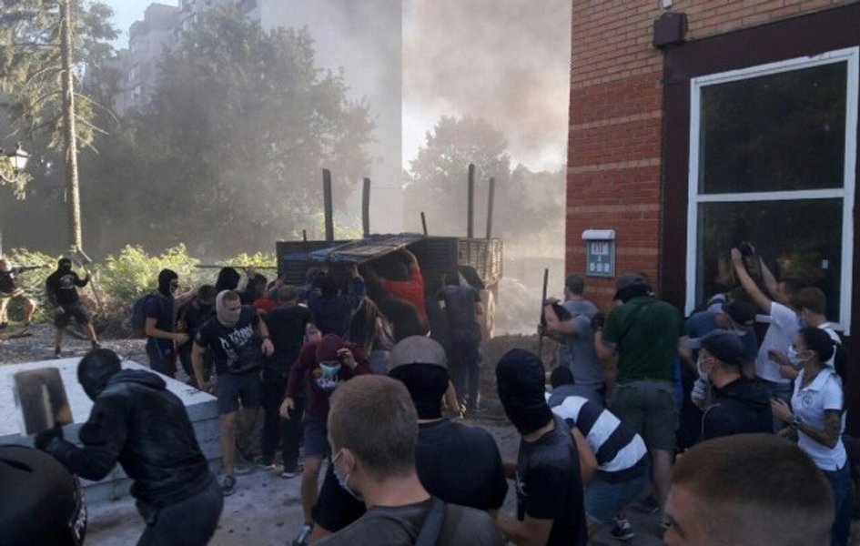 "На Святошинском переулке, 3 возобновились столкновения возле незаконной застройки. Активисты пришли сказать резкое "НЕТ" преступникам, которые, нарушая закон, хотят начать возведение незаконной постройки. Уже перейден второй забор, патриоты готовятся сносить следующие. Приехала полиция. Столкновения продолжаются. Активисты гражданского корпуса АЗОВ забрасывают незаконные заборы петардами и дымами", – сообщил "Азов".