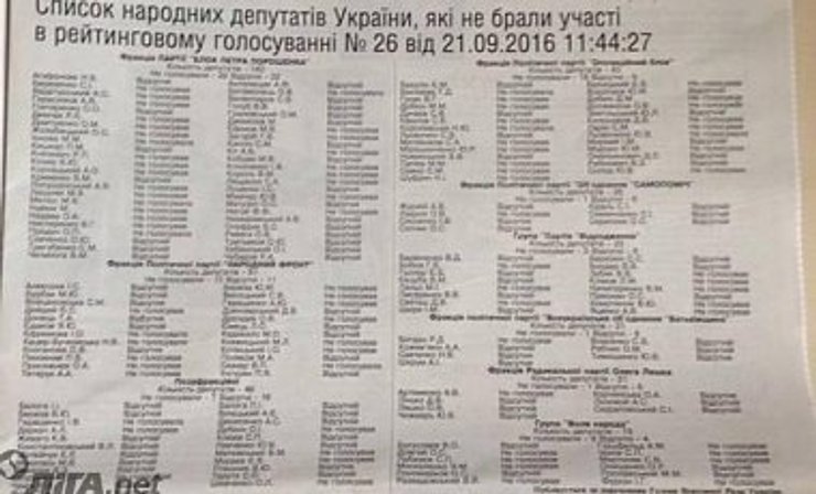 Во фракции политической партии "Оппозиционный блок" из 43 депутатов не голосовали 18, а отсутствовали 9. В "Самопомощи" из 26 человек не голосовал один депутат, на заседании отсутствовали шесть. В группе партии "Возрождение" из 23 народных депутатов не голосовали восемь, такое же количество депутатов не посетили заседание.