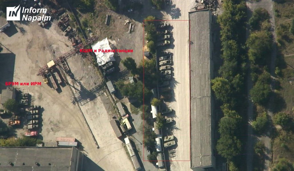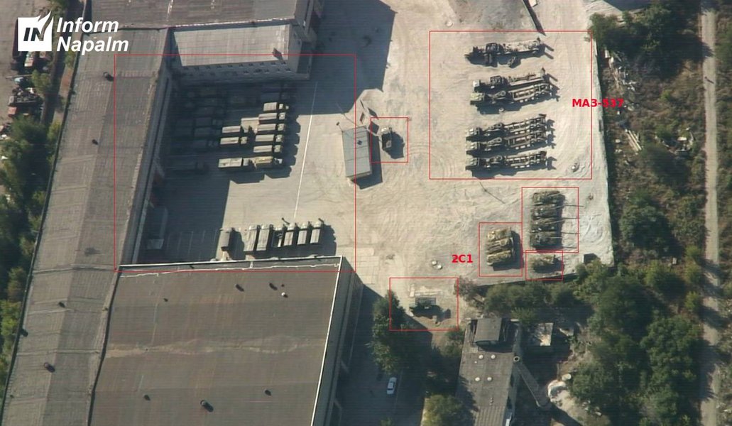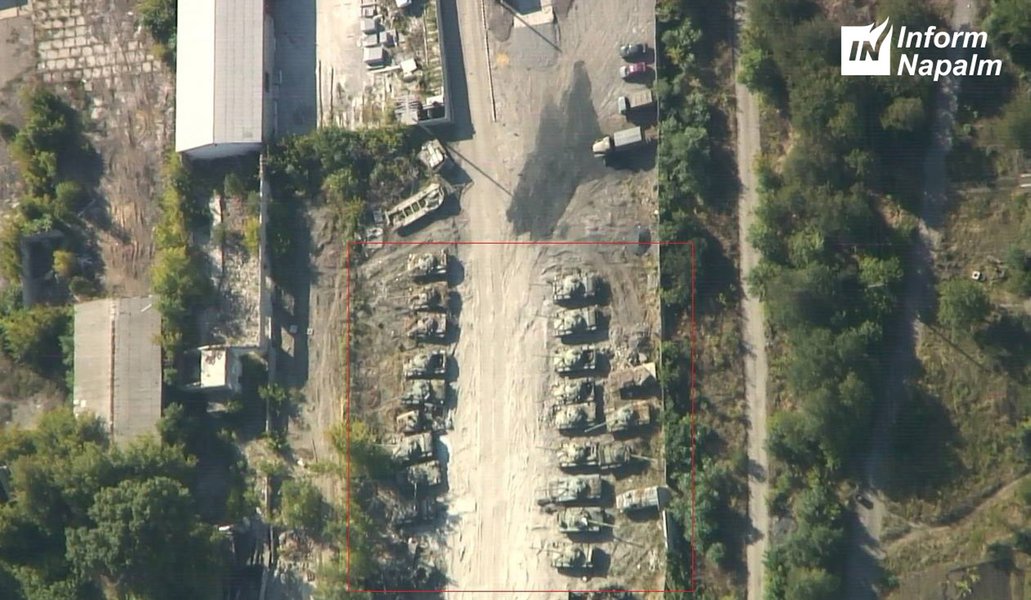 Эксклюзивные снимки передала международному разведывательному сообществу InformNapalm волонтерская аэроразведка. В ходе их анализа установлено, что в одном из районов оккупированного города Донецк в расположении боевиков находится крупное скопление вооружений. Кроме автомобильной техники, тягачей МАЗ-537, БМП, КШМ и МТ-ЛБ выявлено свыше 20 единиц танков Т-64БВ и Т-72Б разных модификаций (калибр 125 мм), а также как минимум 2 единицы САУ 2С1 "Гвоздика" (калибр 122 мм).