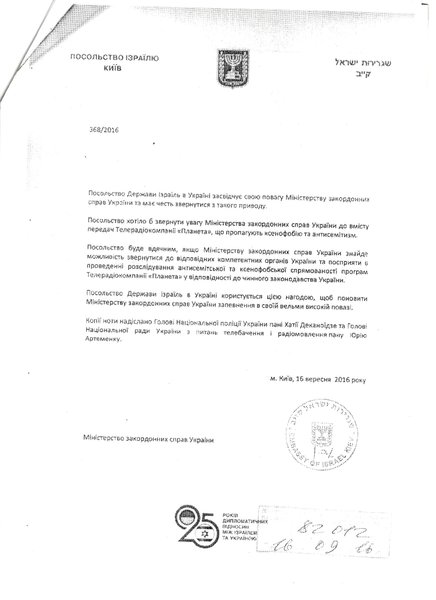Посольство Израиля в Украине передало МИД Украины ноту относительно содержания передач телерадиокомпании "Планета", по мнению посольства, пропагандирующих ксенофобию и антисемитизм. Об этом сообщает пресс-служба Нацсовета по вопросам ТВ и радиовещания.