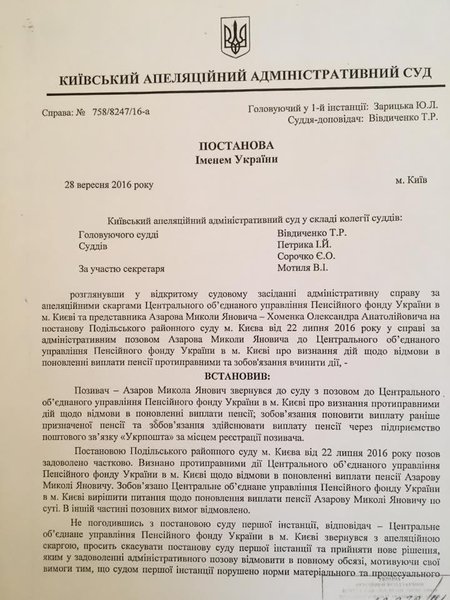 "Пенсионный фонд подал апелляцию на такое решение суда и выиграл ее. На нашем споре точку поставил Киевский апелляционный административный суд, который четко признал ошибку Подольского суда и отменил решение этого суда о возобновлении выплаты пенсии Азарову", - сообщил Розенко.