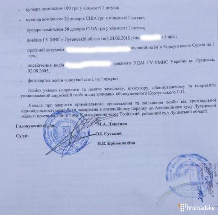 "Согласно пояснениям прокурора, установлено, что в ходе досудебного расследования не было установлено никаких фактов совершения С.А. Корсунским других преступлений, кроме участия в террористической организации. При этом Корсунский С.А. добровольно сообщил правоохранительным органам о деятельности террористической организации "ЛНР" и способствовал раскрытию преступлений террористической организации "ЛНР", - говорится в решении суда.