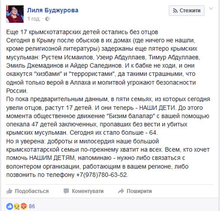 "Пока предварительным данным, в пяти семьях, из которых сегодня увели отцов, растут 17 детей. И они теперь – НАШИ ДЕТИ. До этого момента общественное движение "Бизим балалар" с вашей помощью опекала 47 детей заключенных, пропавших без вести и убитых крымских мусульман. Сегодня их стало больше – 64", – добавила она. Буджурова также призвала всех неравнодушных помочь опекать этих детей.