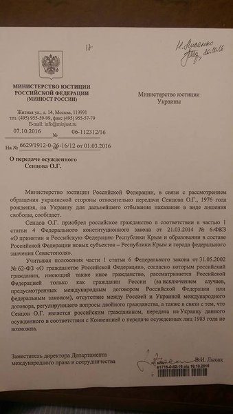 Петухов также обнародовал ответ министерства юстиции России от 7 октября на запрос Минюста Украины о передаче Сенцова.