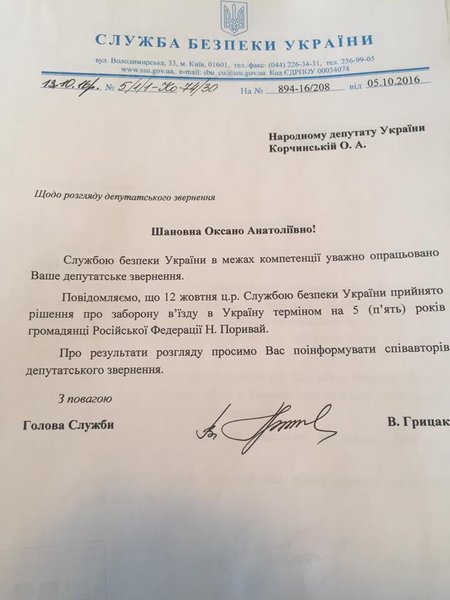 СБУ приняла это решение в ответ на депутатское обращение Оксаны Корчинской.