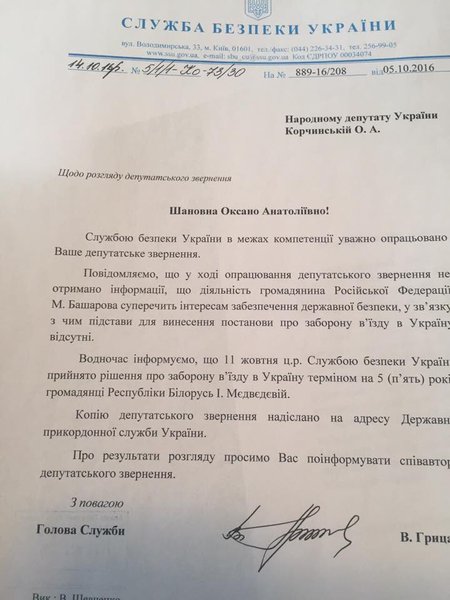 В то же время, в ответ на запрос касаемо Башарова, СБУ сообщила, что не владеет информацией о том, что его деятельность противоречит интересам нацбезопасности Украины, поэтому основания для запрета ему въезда отсутствуют.