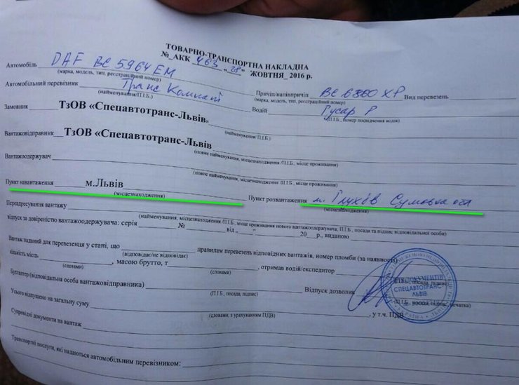 Позже водители показали транспортную накладную, в которой был отмечен только город-отправитель Львов и город, где машины должны быть разгружены – "Глухов, Сумская область". "По словам водителей - они лишь наемные перевозчики, а в Глухове их должен был встретить человек и предоставить дальнейшие указания относительно груза", - сообщили в Нацполиции.