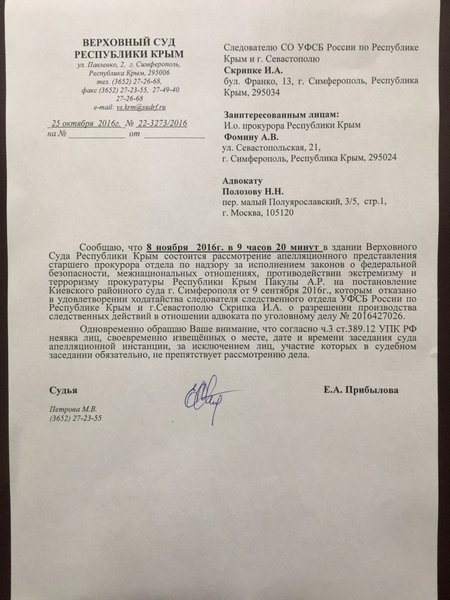 "Узнал, что ФСБ в Крыму хочет проводить следственные действия в отношении меня. Прокуратура пытается им помогать. Теперь в Крыму за мной охотится не только ГСУ СК РФ по РК (главное управление Следственного комитета РФ по Крыму), но и СО УФСБ по РК. Успех. А также признание того, что все правильно делаю", – написал адвокат.