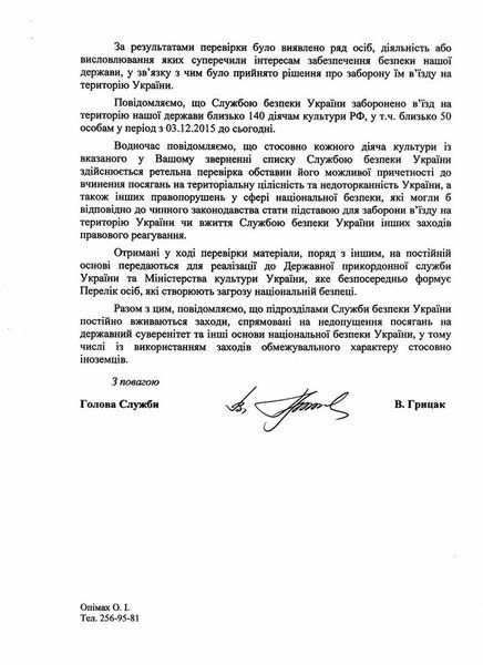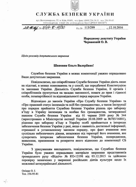 "По результатам проверки было выявлено ряд лиц, деятельность или высказывания которых противоречили интересам обеспечения безопасности нашего государства, в связи с чем было принято решение о запрете им въезда на территорию Украины", – говорится в ответе СБУ.