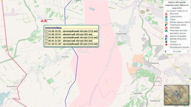 Согласно официальным сводкам АТО, а также интерактивной карте обстрелов украинских войск InfoLight установлено, что на протяжении суток 5 ноября, в 19:20, 20:40 и 21:10 (по киевскому времени), населенный пункт Новозвановка обстреливался именно из орудий калибром 152 мм. "Есть все основания полагать, что российские оккупационные войска использовали для обстрелов украинских позиций в указанном районе именно пушки, попавшие в кадр аэроразведки", - говорится в сообщении волонтеров.