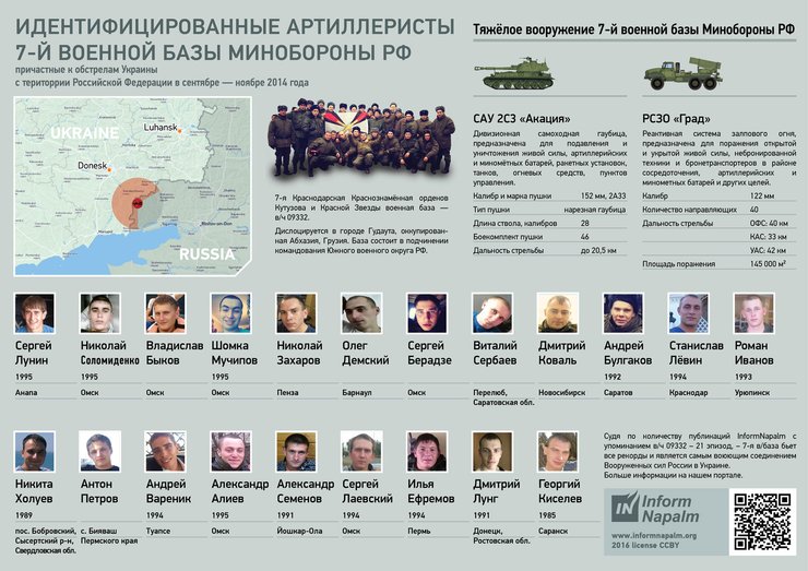 Новое расследование волонтеров было нацелено на выявление и опознание российских военнослужащих-артиллеристов 7-й военной базы (в/ч 09332, базируется в Гудауте на территории оккупированной Абхазии) 49-й общевойсковой армии Южного военного округа Вооруженных сил России, которые в составе сводного артиллерийско-реактивного дивизиона привлекались к обстрелам украинских городов, сел и позиций сил АТО с конца августа по декабрь 2014 года.