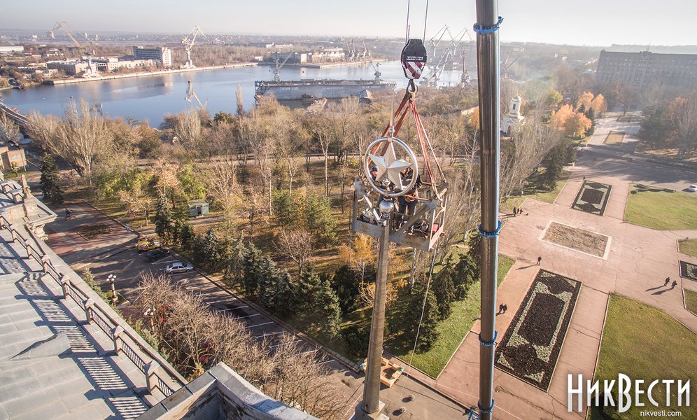 Как отмечает издание, один из сотрудников, который выполнял высотные работы по установке герба, является сыном того, кто устанавливал "звезду" на здании мэрии.