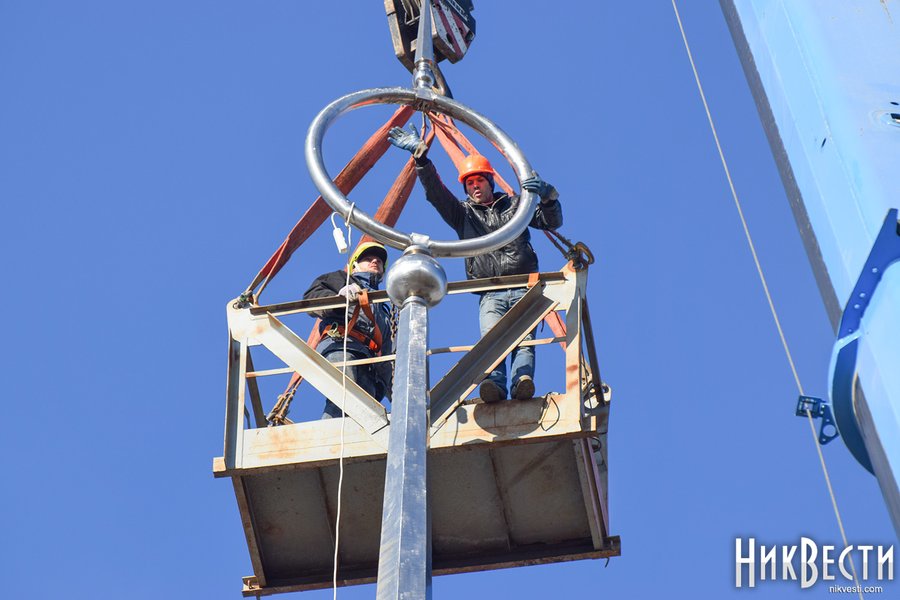 Работы по демонтажу звезды и установка нового символа проводились утром в субботу. Металлическая стела, на вершине которой располагалась звезда, осталась, но в основе круга установили Герб Украины, изготовленный по аналогичным размерам.