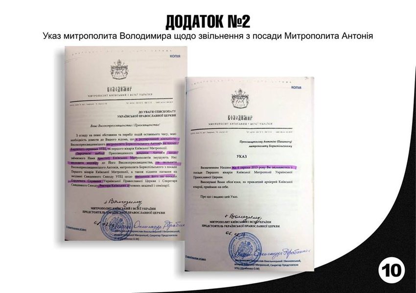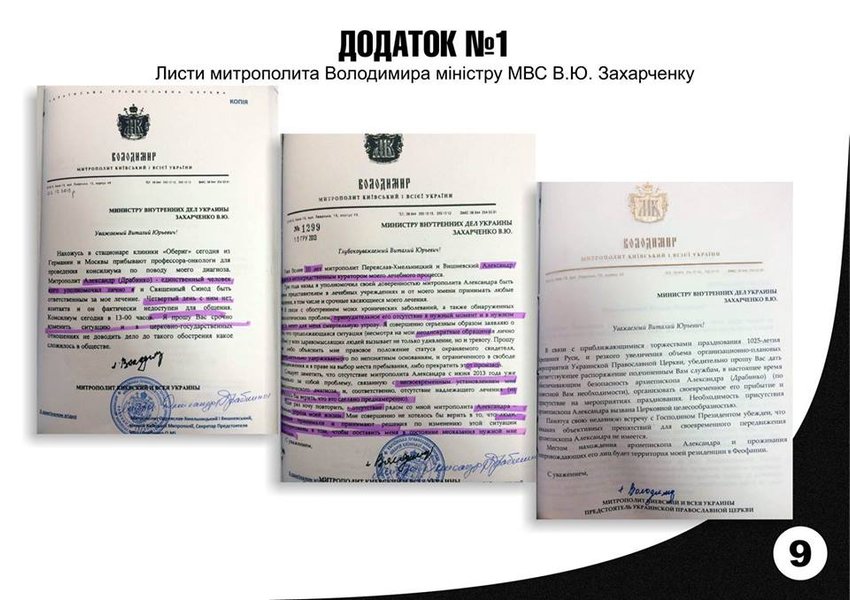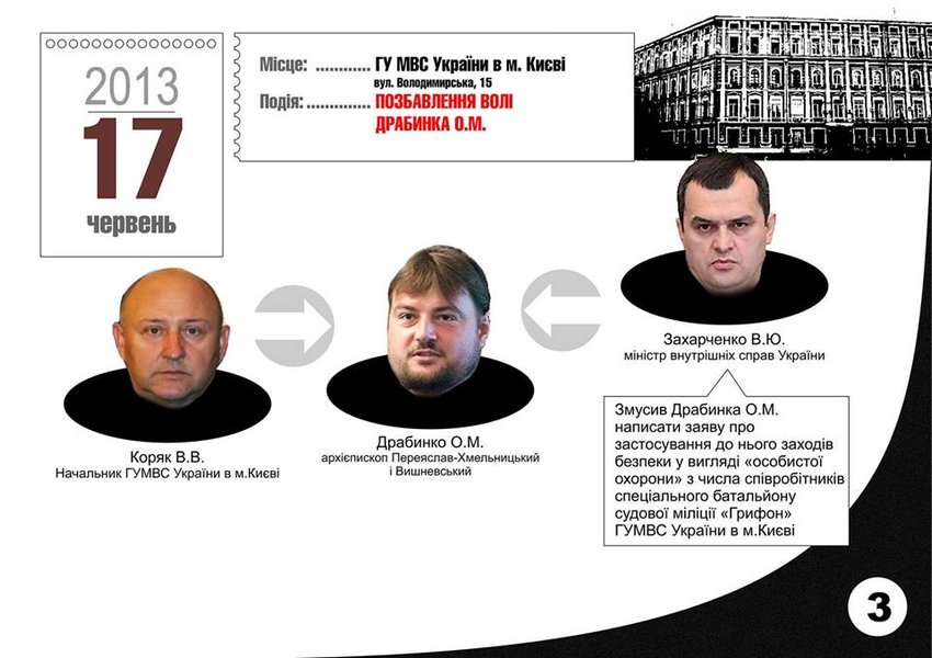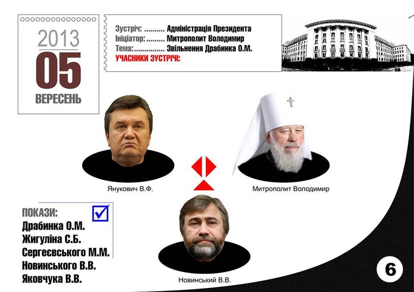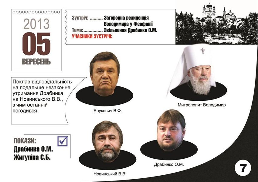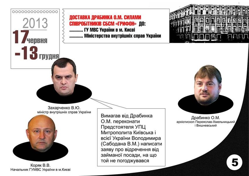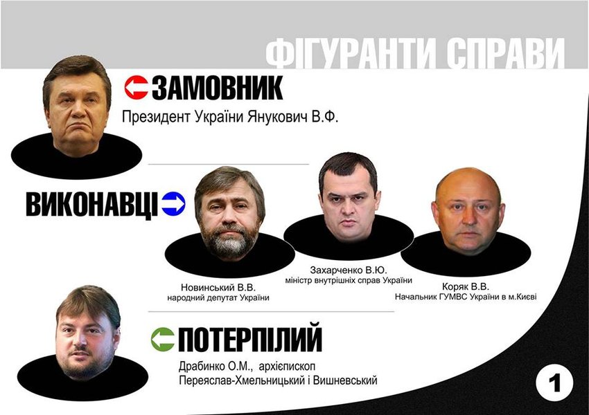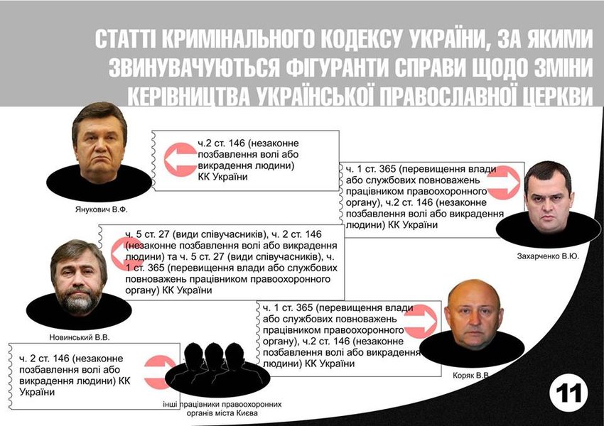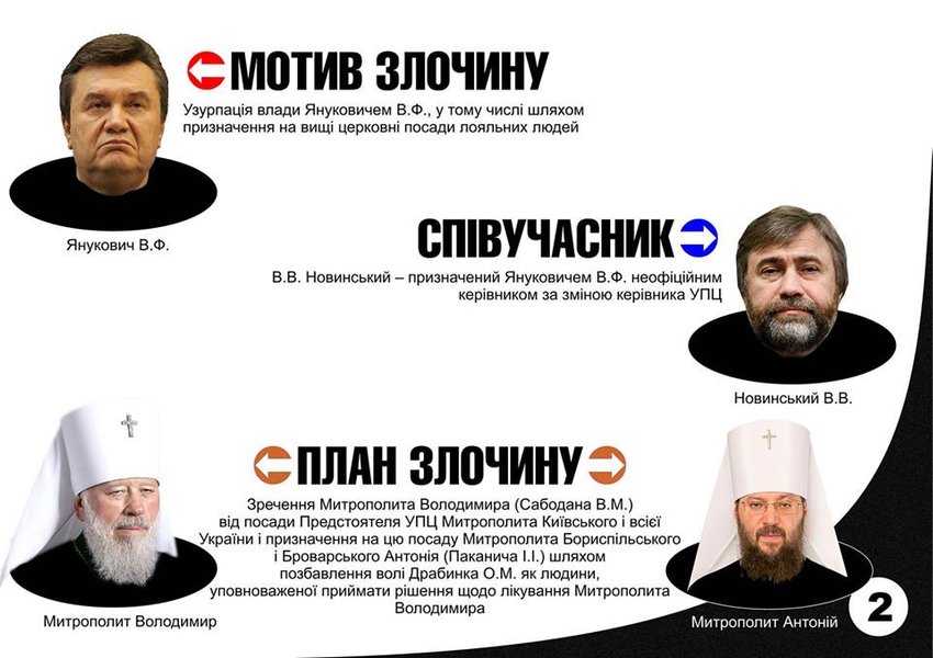 Луценко сообщил, что Янукович планировал использовать УПЦ МП для узурпации власти. С этой целью он собирался проллобировать назначение на высшие церковные должности лояльных к нему людей. Была предпринята попытка добиться отречения действующего на тот момент митрополита Владимира. Ближайший советник церковного иерарха Александр Драбинко был взят под стражу, чтобы шантажировать Владимира и вынудить его отречься.