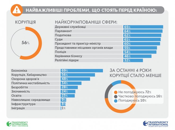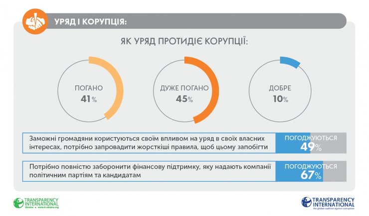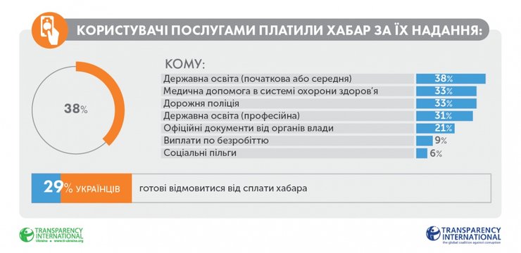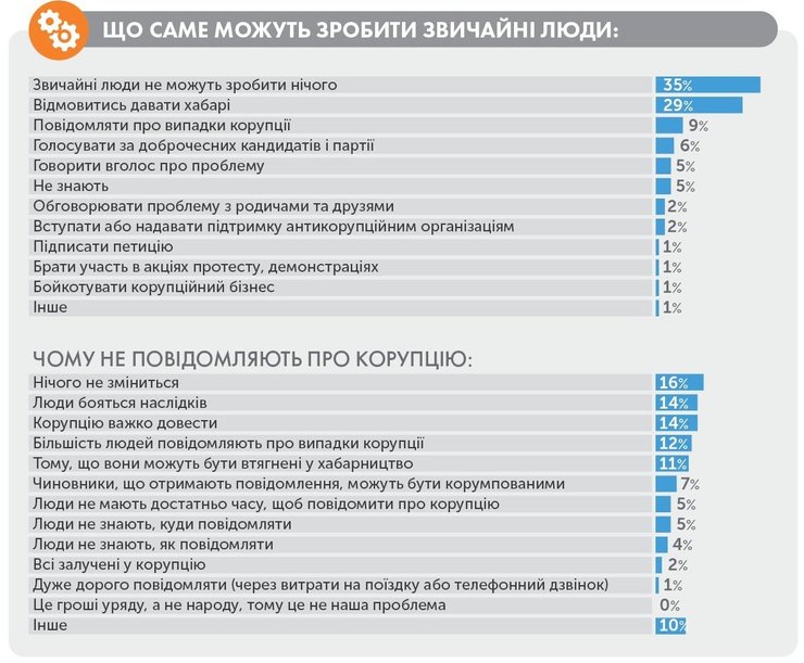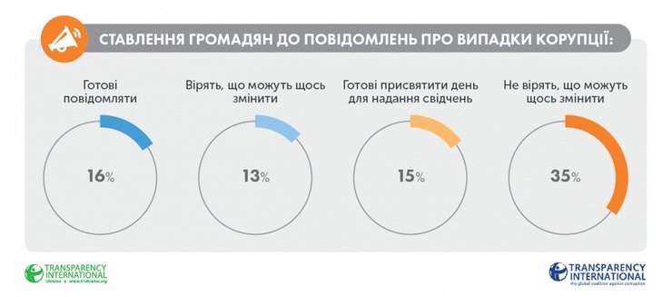 Согласно результатам опроса, которые приводит TI, 29% украинцев готовы отказываться платить взятку, 9% готовы сообщать о коррупции, 6% будут голосовать за добропорядочных кандидатов и партии, 7% готовы вслух обсуждать проблему коррупции, 2% готовы вступить в антикоррупционные организации, а 1% – бойкотировать недобропорядочный бизнес.