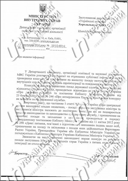 В ответе поясняется, что должности заместителей министра к политическим отнесены законом "О центральных органах исполнительной власти". "Исходя из указанных выше законодательных норм, конкурс на должность заместителя министра внутренних дел Украины по вопросам европейской интеграции не оглашался", - говорится в ответе.