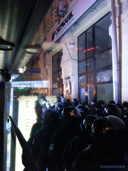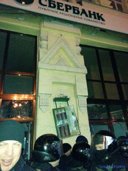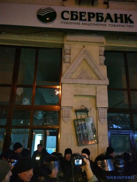 Кроме того, сообщается, что протестующие в центре Киева разбили окна в здании Сбербанка (бывший Сбербанк России) на площади Льва Толстого.