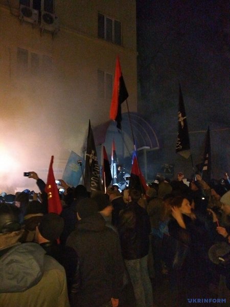 Незадолго до этого лидер добровольческого движения "ОУН" Николай Кохановский призвал людей, собравшихся на центральной площади столицы, пойти к офису "Украинского выбора", который принадлежит Виктору Медведчуку.
