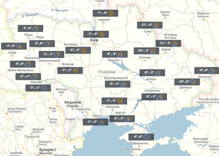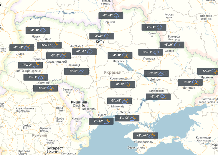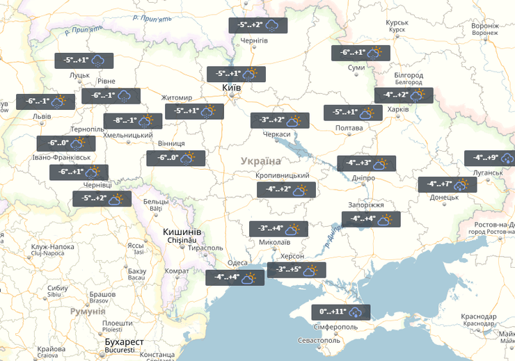 В четверг в Украине погода практически не изменится. Ночью -8°...-1°, днем на западе до +3°.