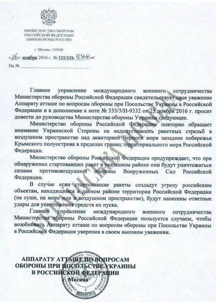 Появилось подтверждение угроз Министерства обороны России, адресованных украинскому оборонному ведомству из-за ракетных учений вблизи аннексированного Крыма. Текст письма, адресованный военному атташе при посольстве Украины в РФ, опубликовала Украинская правда.