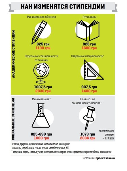 Изменится и размер стипендии, она станет почти вдвое больше. В частности минимальная академическая стипендия теперь будет 1100 грн, а отличники будут получать 1600 грн, вместо 925. При том для отдельных специальностей повышенная стипендия достигнет 2 тыс. грн.