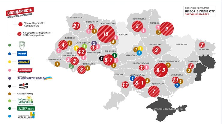 По предварительным подсчетам результатов выборов 18 декабря 2016 года кандидаты от партии "БПП "Солидарность" в большинстве объединенных территориальных общин получили наибольшее количество голосов. Об этом сообщает пресс-служба партии.
