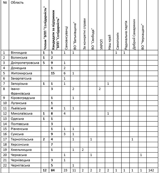 Кроме кандидатов от "БПП "Солидарность", главами общин станут также члены ВО "Батькивщина" - 11, Нашего Края - 2, УКРОПа - 2, ВО "Свобода" - 2, Самопомичи -1, Радикальной партии – 1.
