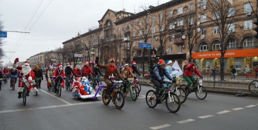 В воскресенье по центральному проспекту Запорожья проехались на велосипедах несколько десятков Дедов Морозов и Снегурочек.
